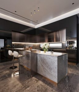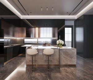 • Vật liệu cao cấp như gỗ, đá marble, kính, kim loại… được phối hợp tinh tế, mang lại cảm giác vững chãi và sang trọng.