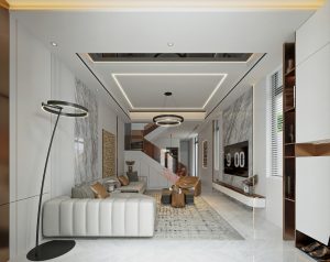 Phòng khách là “bộ mặt” của cả ngôi nhà, thể hiện vị thế của gia chủ. Bởi vậy, sau khi trao đổi với gia chủ, KTS đã thiết kế phòng khách hiện đại, tận dụng tối đa không gia sử dụng. Lựa chọn tone màu trung tính làm chủ đạo đã tạo nên một không gian phòng khách sang trọng. Thêm đó, những món đồ nội thất được sử dụng đều có thiết kế khá tối đem lại sự thoải mái cho các thành viên trong gia đình.